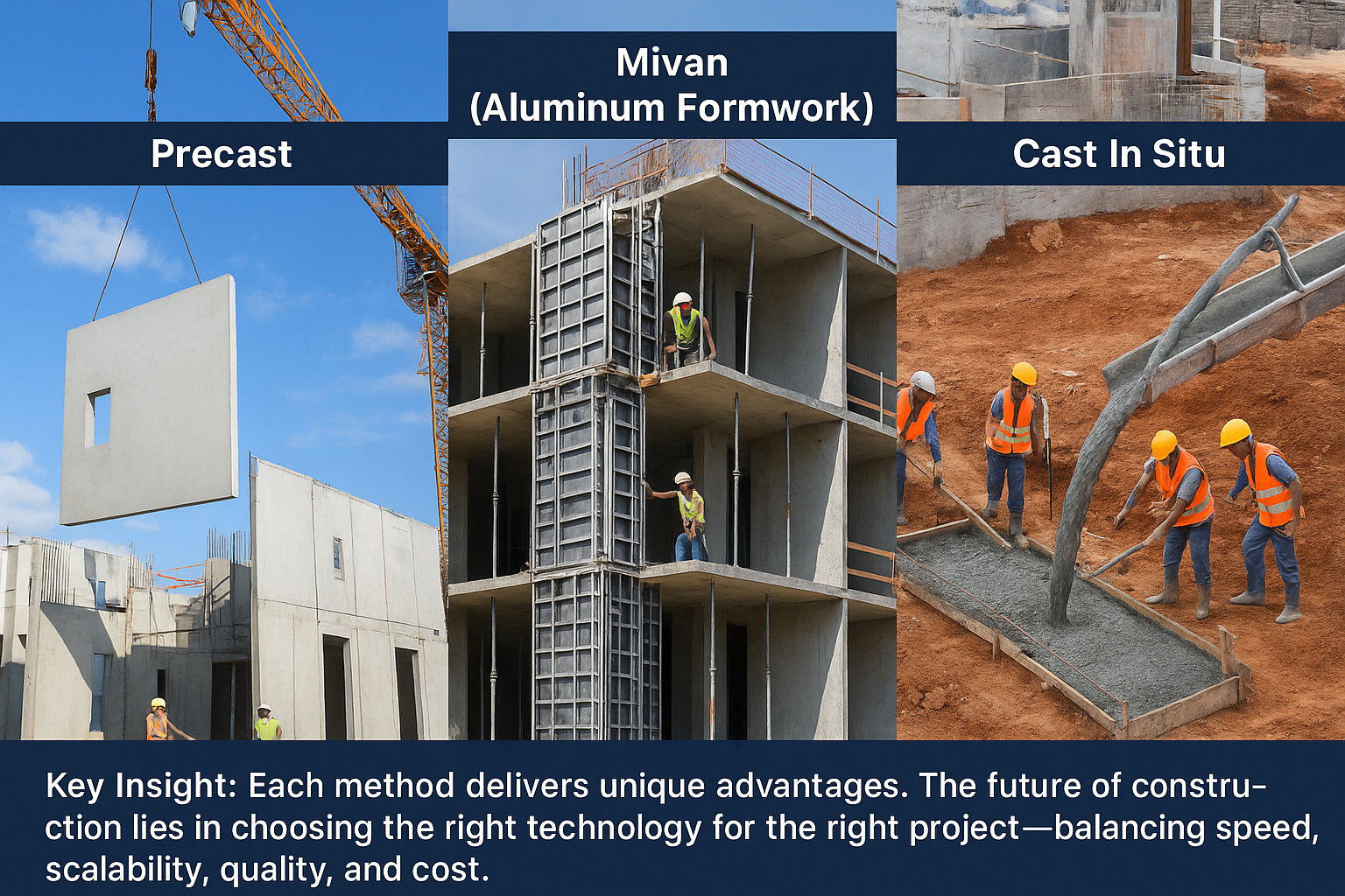 Among the techniques shaping modern construction are Precast Construction, Mivan (Aluminum Formwork) Technology, and Cast In Situ (Traditional) Construction. Each approach brings unique advantages and trade-offs, making it essential to match the method to the project’s needs, budget, and timelines.
