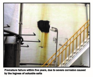 In the first case, a lightweight cement mixture was applied at 50mm directly over an Inorganic Zinc Silicate primer (IZS). The original specification called for abrasive blast cleaning followed by 75microns of zinc silicate coating, followed by 50mm of lightweight cement fireproofing compound. No exterior sealing of the fireproofing was recommended at the time of installation, nor was the IZS top coated. The primary reasons for the failure was twofold, firstly the zinc coating should have been sealed, reason they have very little resistance to high alkali solutions.